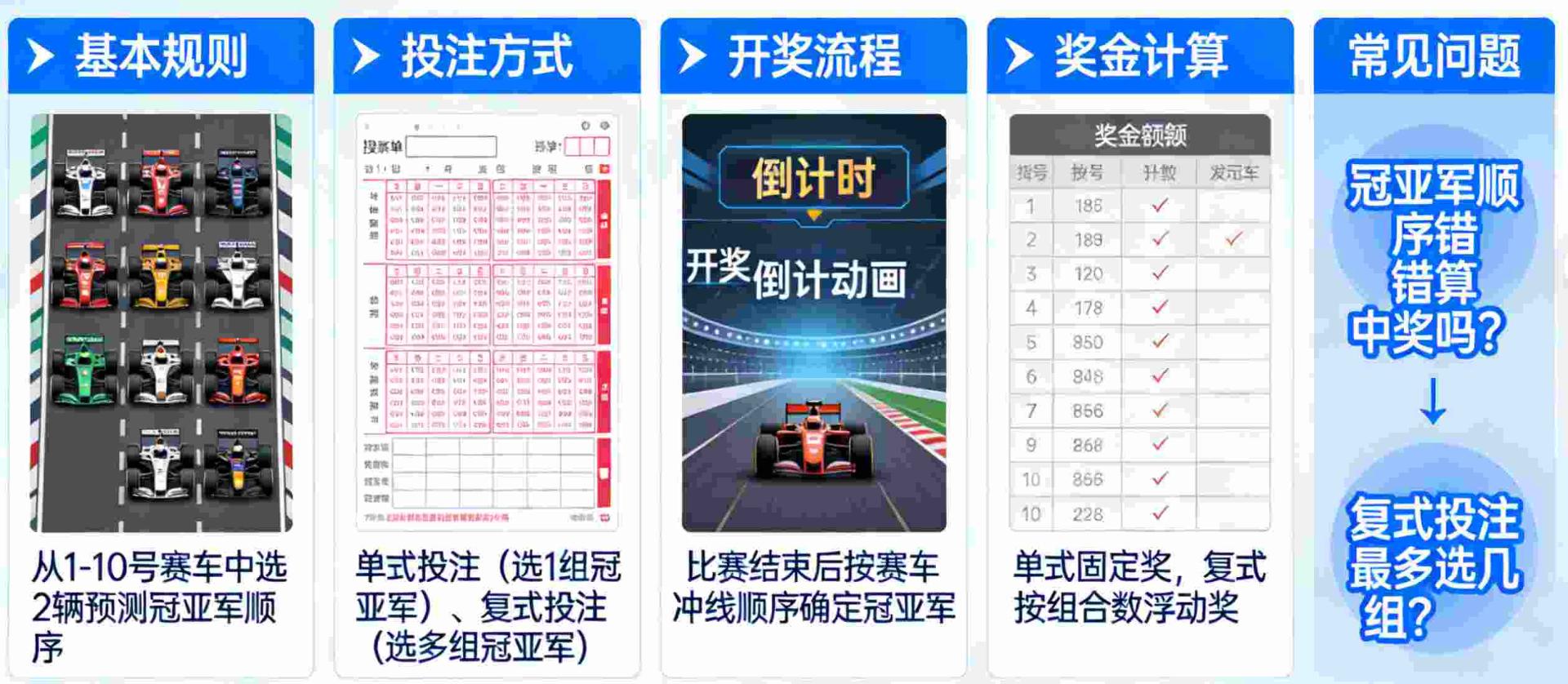 北京赛车PK10的核心,就是模拟北京赛车场十辆不同颜色赛车的真实比拼,每期开奖从早上9:07到晚上23:57,每五分钟一轮,一天179期,每辆车的号码固定1到10(1号红、2号蓝以此类推),最终排名决定开奖结果:第一名叫冠军(冠軍)、第二名亚军(亞軍)、第三季军一直到第十名。冠亚军玩法,就是专注前两名车的互动,占比玩法总量的40%以上,因为赔率高、计算简单、入门口槛低,我第一次玩就是在2021年北京雾霾天,下班后充50元试水,押冠軍單号5赔9.5倍,中了赚47.5,那一刻心跳加速像真坐赛车。规则最基础:每期结果公布后,冠亚两车号就是你的战场,玩法分直选、和值、组合、两面、龙虎五大家族,每种都有独特门槛和爆点。